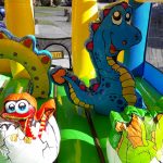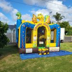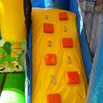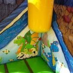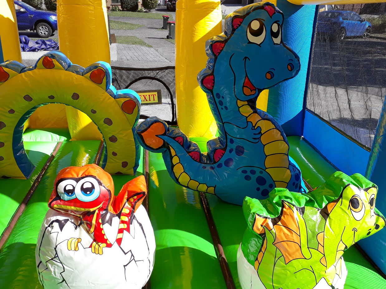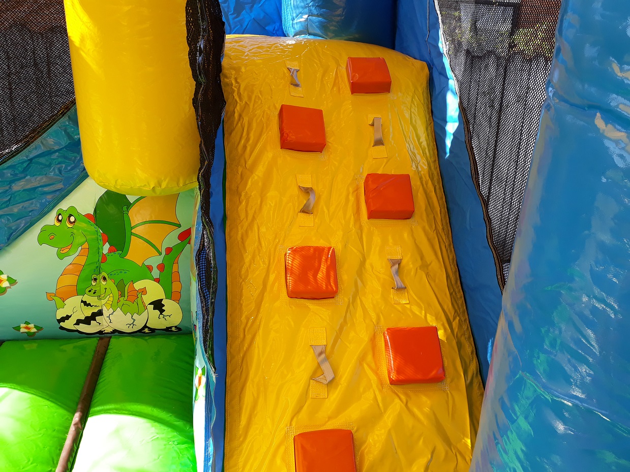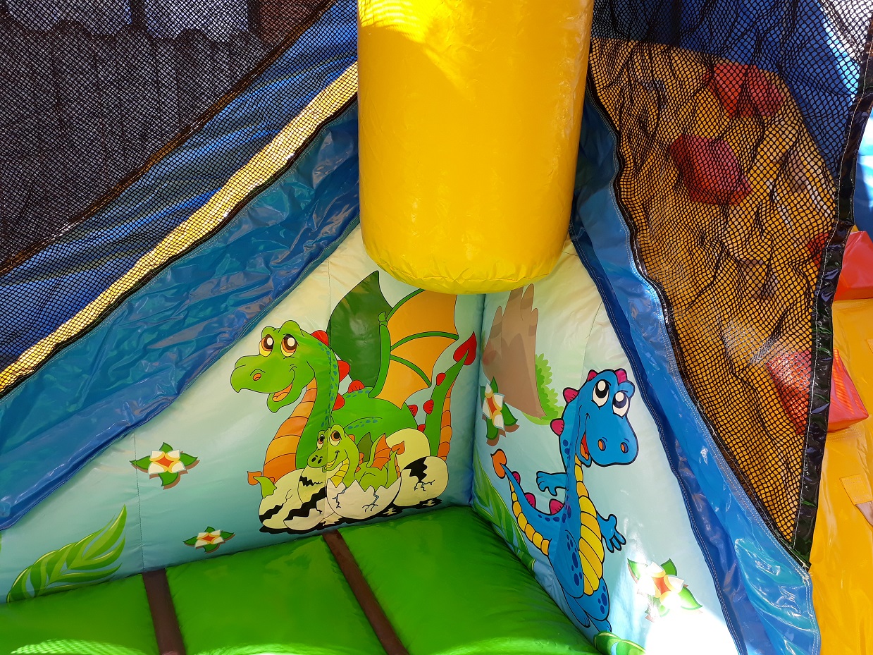 This eye-catching Dinosaur themed combo unit includes a bouncing area and a slide to the side, both fully enclosed.
